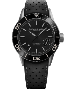 300Mの防水性能にセラミックベゼルを使用している本格的なダイバーウォッチでありながら、エレガントでカジュアルなデザインがアーバンなレイモンドウェイルのダイバーシリーズ。