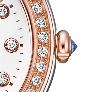 しずくをモチーフにしたりゅうずには、ブルーサファイア配し、あえてキューレット部が表になるようセッティング。ブルーサファイアは「知性と集中力を高める」宝石と言われ、この時計を身に着ける女性に自信と輝きをもたらすよう、願いを込めています。
