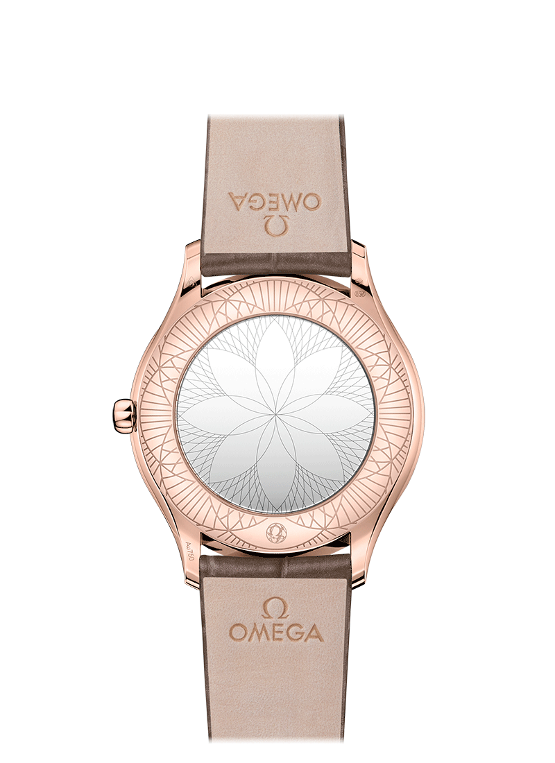 36mmのスリムなケースは18Kセドナゴールド製で、両サイドを曲線に沿ってダイヤモンドが飾ります。リュウズはレッドのハイセラムでポリッシュ仕上げが施されており、ダイヤモンド1個がセットされています。ラッカー仕上げのトープブラウンのダイアルには、エンボス加工を施した18Kセドナゴールドのローマ数字と、同じ18Kセドナゴールドを使用した針が配されています。