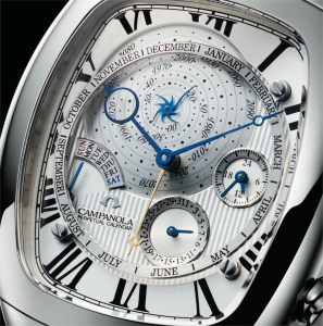 カンパノラではしばらくぶりとなるトノー型のケースを新規作成。最新技術と人の手作業による精巧の結晶です。ダイアルには大小の円弧が配置されています。それそれが年・月・日・曜日などを表し、特に年表示部はなだらかなドーム状に仕上げられた精巧な作り。時の螺旋イメージした渦巻きとストライプを組み合わせた、立体的でユニークな印象となっています。