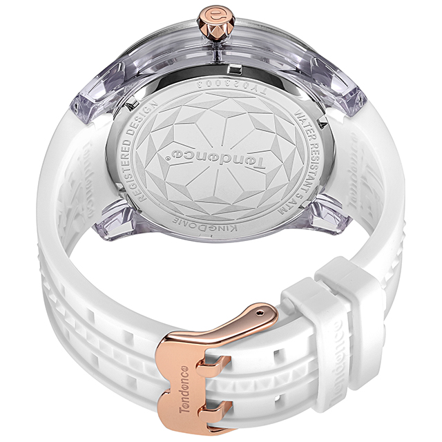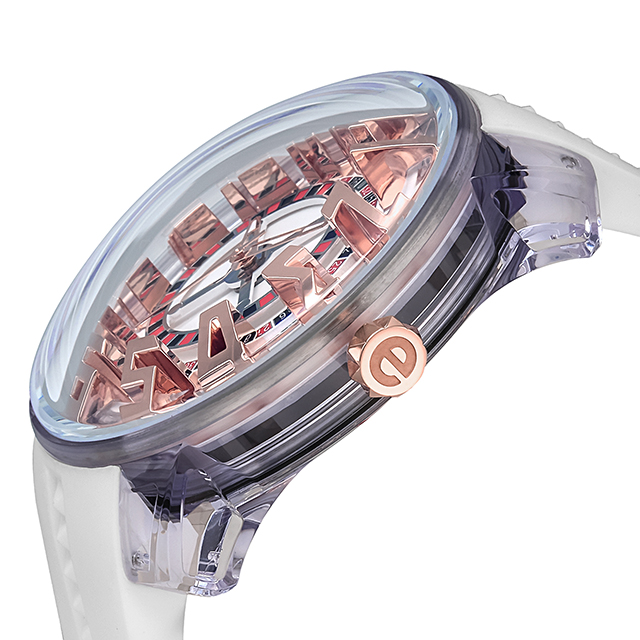 このドーム屋根の構造を厚みのあるミネラルガラスで再現。 また、回転式のダイヤルでドーム内部のスロープも再現しています。テンデンスの特徴でもある3Dインデックスも、ドームの形状に沿うように新しくデザインされています。