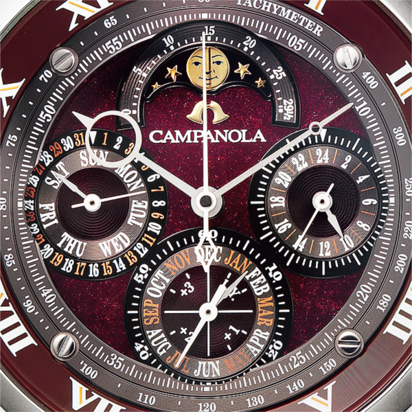 ミニッツリピーター、ムーンフェイズ、パーペチュアルカレンダー、クロノグラフという4大複雑機能を搭載したクォーツウォッチ。裏ブタにはミニッツリピーターの奏でる美しい音色を振動板から外に伝えるために放音孔が設けられています。