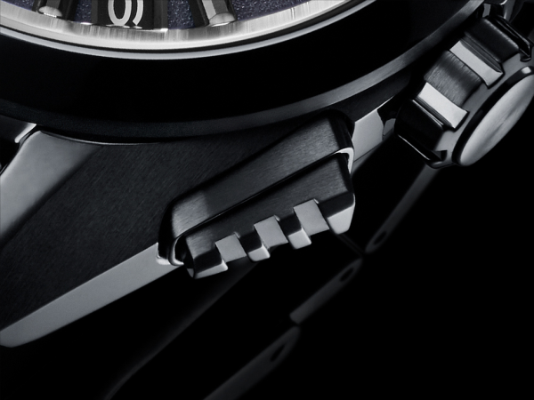筋目仕上げと鏡面仕上げを織り交ぜたケースは、20気圧防水に大型のプッシュボタンとリューズを備え、タフで美しい、新たなスポーツデザインとなっています。またこのモデルのみ新しい質感のブラックアスファルトパターンダイアルを採用。プッシュボタンも専用の溝入り形状でグリップ感を高めたユニークでスポーティーな雰囲気を纏っています。