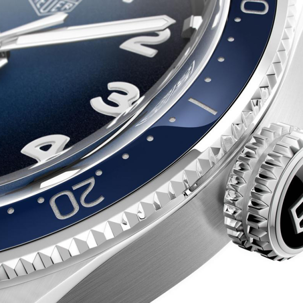今回クロノグラフモデルに続き3針のシンプルモデルが追加されました。大きく操作しやすいリューズ。アラビア数字インデックスがしっかり記載されたパイロットウォッチをルーツに持つ時計ならでは。セラミック製の回転ベゼルは、オリジナルモデルよりも細く、外側に向かって濃くなるグラデーションダイアルと相まって、モダンクラシックの雰囲気を与えます。