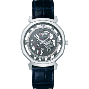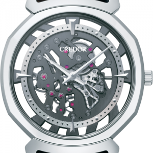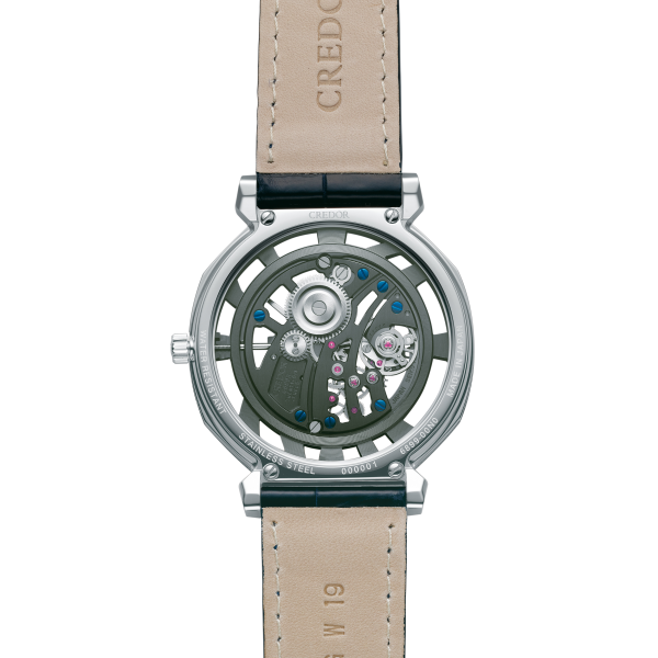 岩手県の雫石高級時計工房にて少数の熟練時計師が1日かかって1個組み上げる、技術の粋を凝らした極薄ムーブメントをより美しく見せる為表裏両面からスケルトン化。