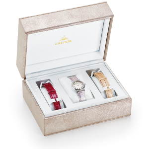 時計にセットされているのは、レディスで初となるKYOTO Leather(京都レザー)の箔押しストラップ。ピンク色を中心とした色とりどりの箔を使用しております。また1本1本その表情は異なるので、数量限定と合わせて世界に一つだけの特別感を感じていただけます。同梱のスペアのストラップは、どんな服装でも合わせやすいパールピンククロコダイルと、コーディネートの差し色となるパールマゼンタクロコダイルの2本をご用意。簡易脱着レバーが付いているので、その日の装いに合わせてサッと付け替えていただくことができます。
