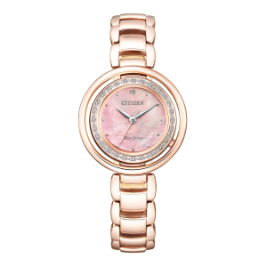 美しい白蝶貝ダイアルに可憐さをプラスする1ポイント、そして29ポイント、合計0.1カラットのダイヤモンドがケースをぐるっと囲み、エタニティリングの重ね付けを思わせるプレーンな外周リンクトの組み合わせが上品で華やかな印象に。