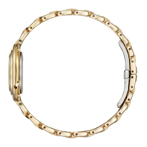 美しい白蝶貝ダイアルに可憐さをプラスする1ポイント、そして29ポイント、合計0.1カラットのダイヤモンドがケースをぐるっと囲み、エタニティリングの重ね付けを思わせるプレーンな外周リンクトの組み合わせが上品で華やかな印象に。