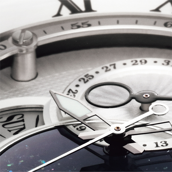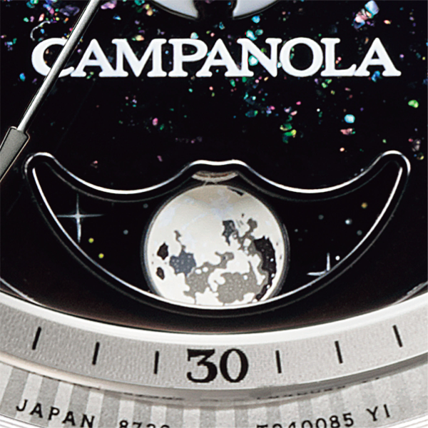世界に誇る伝統工芸の漆と、最新のソーラー発電技術が組み合わされた新モデル。一番大きく変化したのが6時位置のムーンフェイズ。湾曲した傘型のディスクに変更し、8回の版を重ねることで緻密な月と星をリアルに表現。日々変化する月の表情を愉しむことができます。またこのモデルの特徴であるダイアルは、電気鋳造技術を用いて細かなパターンを表現。漆と螺鈿(らでん)で、美しい夜空をより広くなったサブダイアルに描きました。