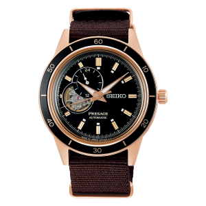 ダイアルの9時位置がスケルトンになったオープンハートデザイン。ムーブメントの鼓動をより身近に感じられます。ヴィンテージカラーの蓄光塗料を採用して雰囲気を高めています。またプレザージュ初のナイロンストラップを採用し、ライフスタイルや好みに合わせてお使いいただけます。