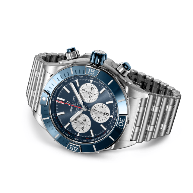 直近のクロノマット JSPと同サイズの44mmにサイズアップし、ベゼル・リューズ・プッシュボタンにセラミックを採用。エレガントで艶やかな質感と、傷つきにくい実用性を両立させることができています。裏ブタはシースルーバックとなっており、自社製クロノグラフキャリバー「B01」の鼓動を感じつつクロノグラフの精密な動きを楽しむことができます。モダンな万能クロノグラフモデルとして使いやすいモデルです。