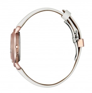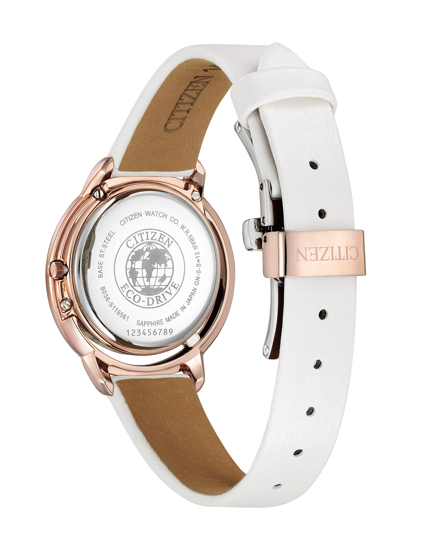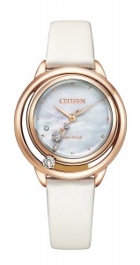 白蝶貝の文字板と白のサテン風ストラップが爽やかな表情を演出。文字板、ガラス、ケースにセッティングした合計5ポイントのダイヤモンドが魅惑の輝きを放ちます。
