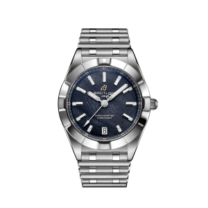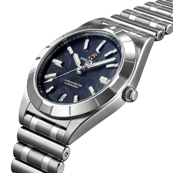 レギュラーモデルと共通している意匠化されたライダータブのあるベゼルや秒針の後端のロゴマーク、ダイアルにはしっかり刻まれた目盛り、レトロな雰囲気のルーローブレスレットと随所にブライトリングらしさを感じることができます。