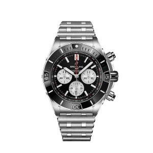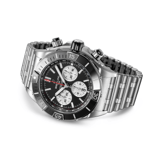 イタリア空軍 フレッチェ・トリコローリのために開発され、1984年に発売された初代クロノマット「フレッチェ・トリコローリ・クロノグラフ」のデザインDNAを受け継ぎ、モダンスタイルにリ・デザインされたモデルとして発表されました。アーネスト・シュナイダーと共に新たなブランドの光となり、スタイリッシュで信頼性のあるクールなクロノグラフとして発売後たちまち人気を博しました。 クロノマット 44、クロノマット JSPと同サイズの44mmにサイズアップし、ベゼル・リューズ・プッシュボタンにセラミックを採用。エレガントで艶やかな質感と、傷つきにくい実用性を両立させることができています。裏ブタはシースルーバックとなっており、自社製クロノグラフキャリバー「B01」の鼓動を感じつつクロノグラフの精密な動きを楽しむことができます。モダンな万能クロノグラフモデルとして使いやすいモデルです。 ルーローブレスレットならではの柔らかさとフィット感、そこから生まれる着け心地の良さも好ポイント。特にこのブラックダイアルは特徴的なクォーツUTC付きのメタルブレスレットもあり、過去に作られたモデルの復活という側面も持ちます。勿論メタルブレスレット、ラバーストラップに付け替えることも可能。ブラックダイアルだけのバリエーションです。