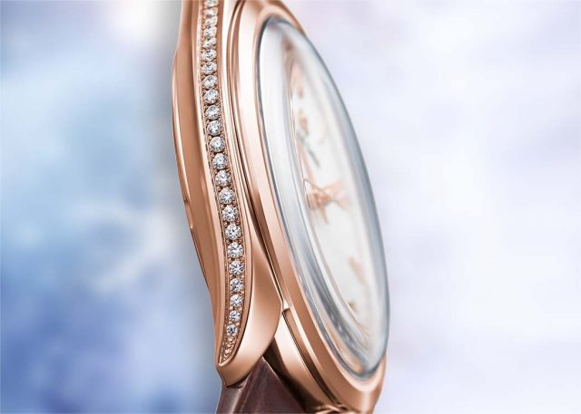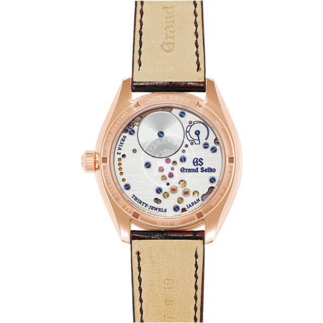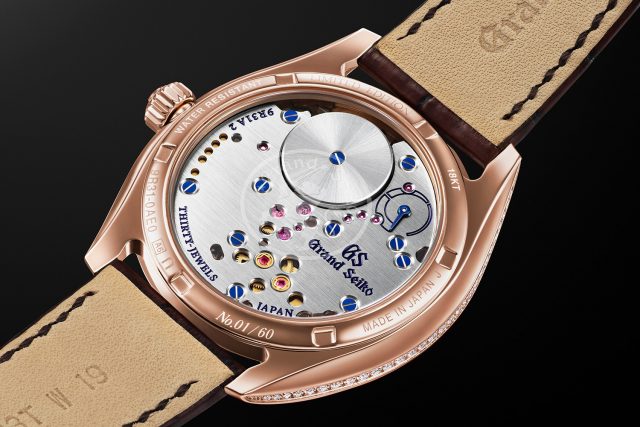 木の枝にしんしんと降り積もった雪がこぼれ落ちる「垂り雪(しずりゆき)」。スプリングドライブが生み出される信州の冬に見られる情景をテーマにしたモデルです。新雪のように真っ白なダイヤルに加え、木の枝からこぼれ落ちる雪のさまをケースサイドのダイヤモンドで表現しました。