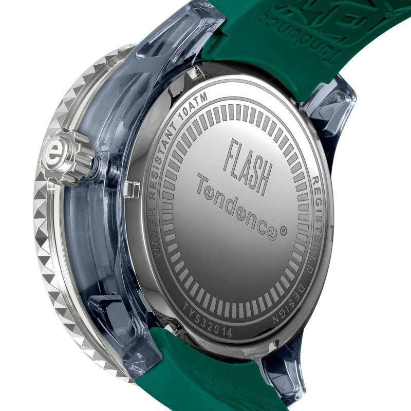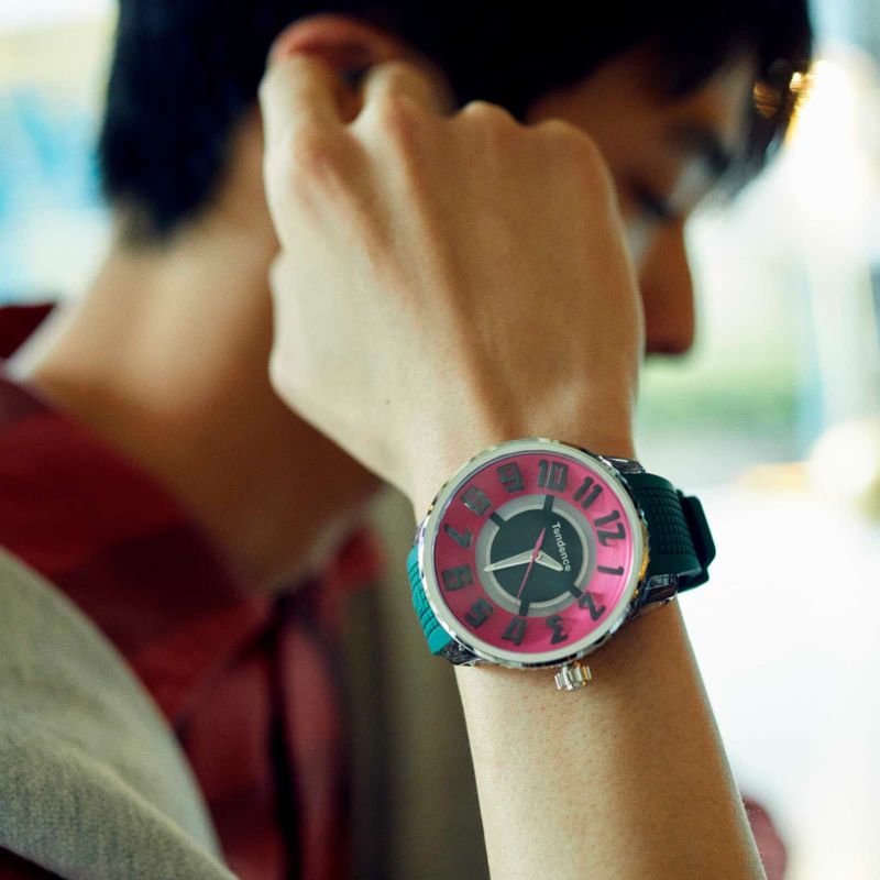 スニーカーからインスピレーションを得た鮮やかなカラーリングが特徴の『FLASH Street』 。 ピンク/ブラックのダイヤルにグリーンストラップ。主張の強いカラーを透明なクリアケースが中和する絶妙なバランスが特徴。 ケースのナイロン、ベゼルのステンレス、ストラップのシリコンラバーなど、スニーカーにも見られる異素材の組み合わせにより、スポーツとラグジュアリーのミックススタイルを実現しています。