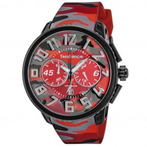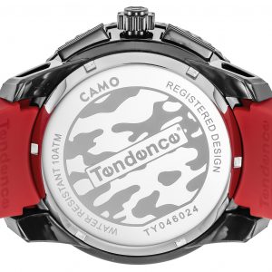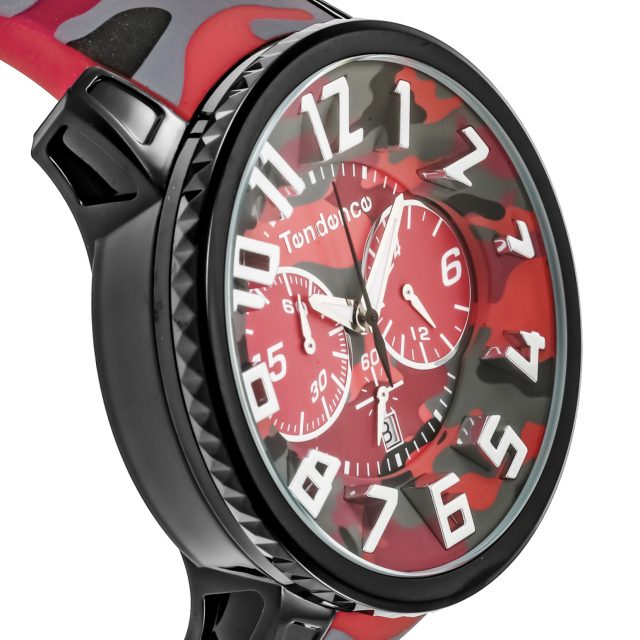 ブランドとしては珍しく、フェイスからストラップまで総柄でデザインされています。クロノグラフ部分にも迷彩柄がプリントされ、テンデンスのDNAである立体インデックスが浮かび上がるようなデザインはインパクト抜群です。