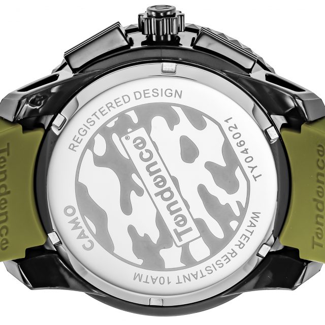 ブランドとしては珍しく、フェイスからストラップまで総柄でデザインされています。クロノグラフ部分にも迷彩柄がプリントされ、テンデンスのDNAである立体インデックスが浮かび上がるようなデザインはインパクト抜群です。
