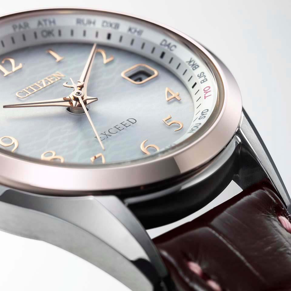 美しい桜の花筏を表現した限定ペアモデル。 川の水面を流れる美しい桜の花びらを文字板に表現したエレガントなデザインの限定モデル。ご夫婦で絶景旅行を楽しんでいただきたいと想いを込めてデザインしました。ベゼル部分にはデュラテクトサクラピンクを採用し華やかな印象に。ピンクのステッチが入ったワニ革の替えバンド付き。