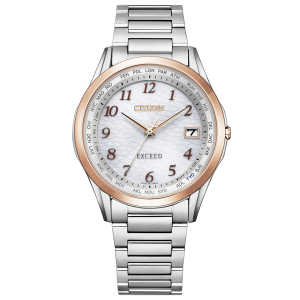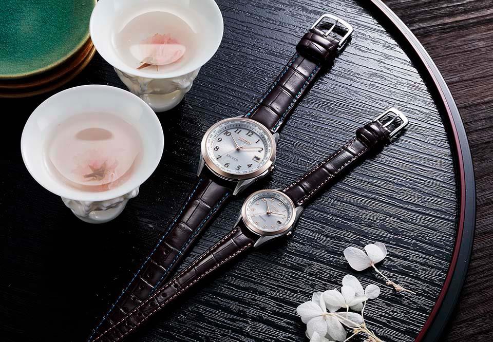 美しい桜の花筏を表現した限定ペアモデル。 川の水面を流れる美しい桜の花びらを文字板に表現したエレガントなデザインの限定モデル。ご夫婦で絶景旅行を楽しんでいただきたいと想いを込めてデザインしました。ベゼル部分にはデュラテクトサクラピンクを採用し華やかな印象に。ピンクのステッチが入ったワニ革の替えバンド付き。