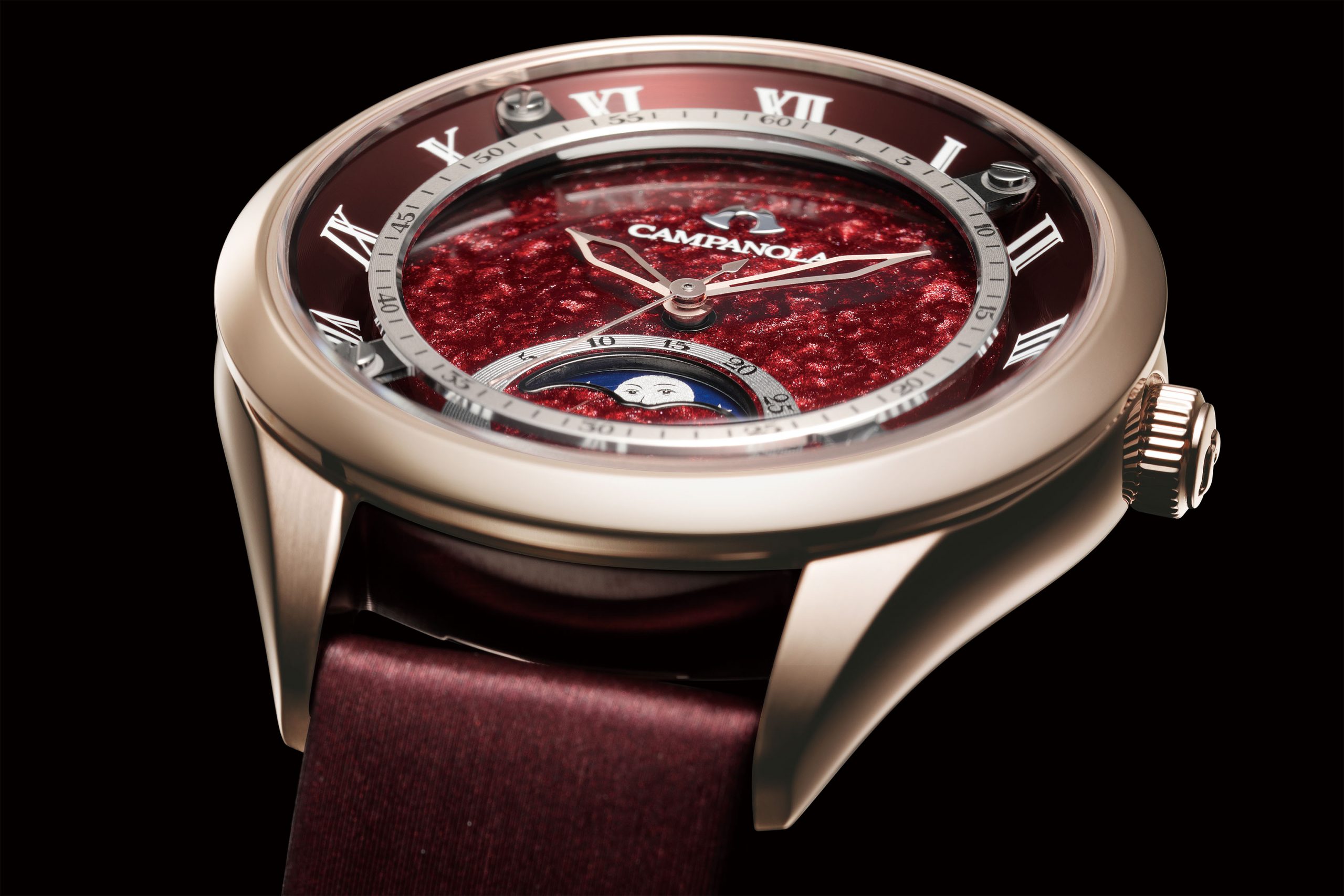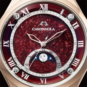 太陽が西に沈み、昼から夜へと移ろう一瞬、茜色に染まって輝く奇跡のような空。「燈寧(あかね)」は朱漆にチタンを混ぜて、その空を描いている。月齢にあわせて月の女神がやさしく微笑む、ミドルサイズのムーンフェイズ・ウオッチ。天空がもたらす美しいひとときを、あなたとともに。