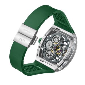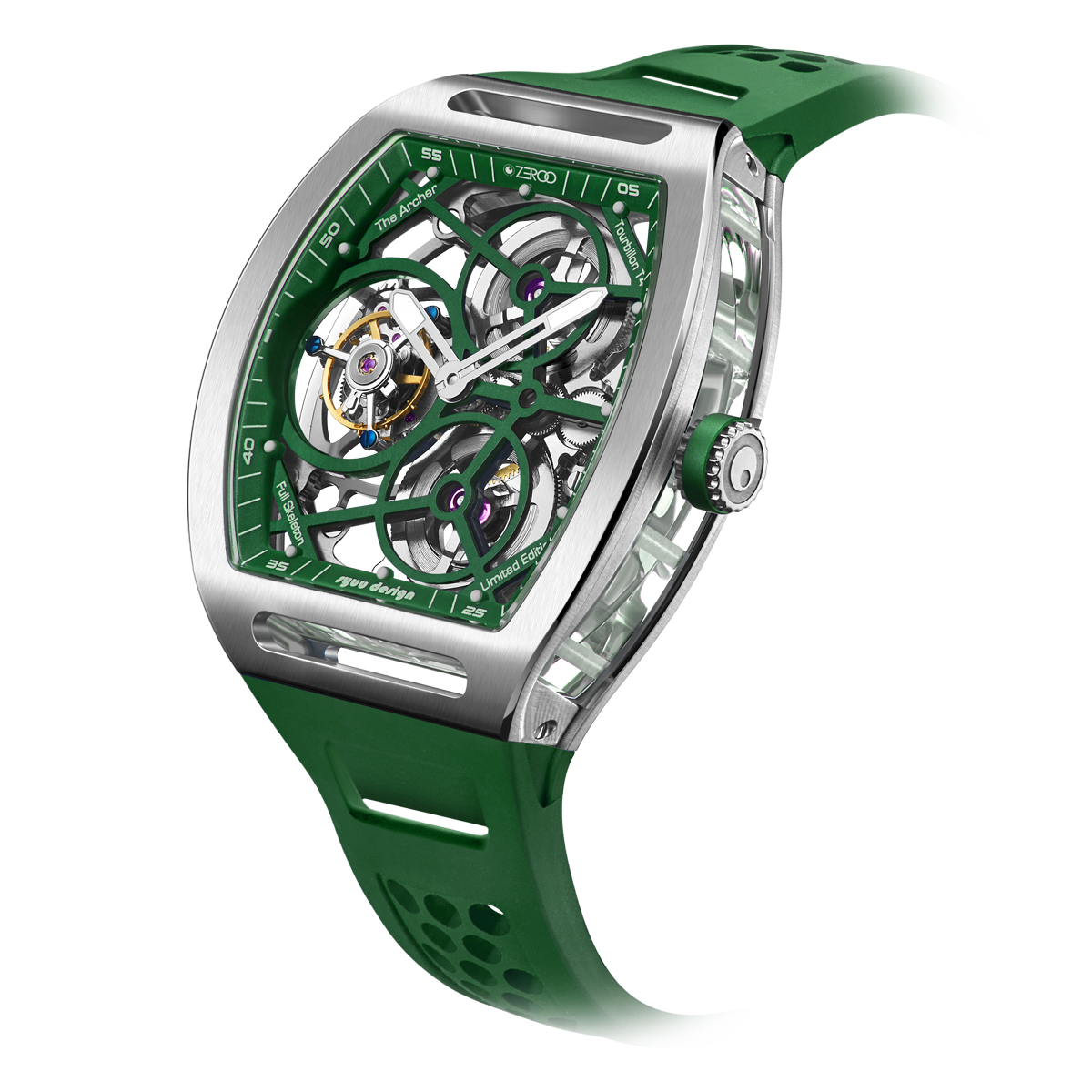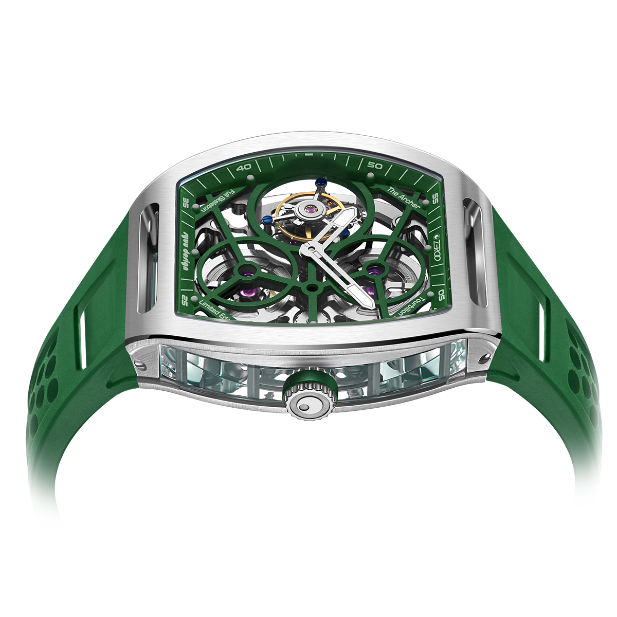 面裏面からだけでなく側面からもフライングトゥールビヨンムーブメントの精緻な動作を堪能できる透明感にこだわり抜いたフルスケルトントゥールビヨン