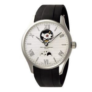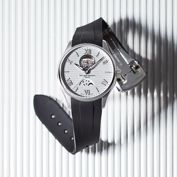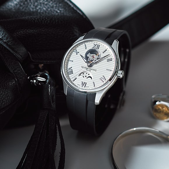ヨットの甲板をイメージさせる立体的なホリゾンタルストライプの文字盤にハートビート。そして、月の神秘さと機能美を堪能できる機構ムーンフェイズを搭載しました。インデックスは白い植字の枠をシルバーで囲み高い視認性を確保、ベルトはしなやかなラバー素材を採用したマリンテイスト香るエレガントスポーティウォッチです。