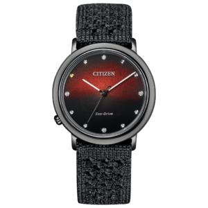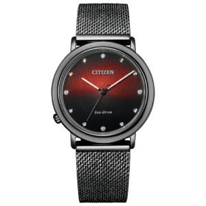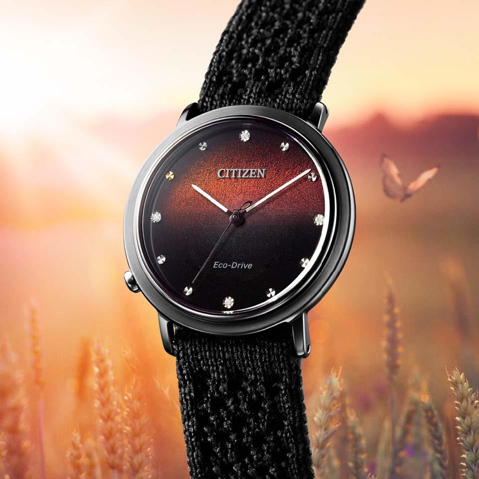 文字板には富士フイルムの構造色インクを使用し、表面のミクロな構造が光を反射することによって現れる自然界の美しい構造色を再現。動くたびに変わる豊かな色と表情が魅力です。 「火」をテーマにしたCITIZENL10周年記念限定モデル。黒から赤に変化する文字板が、水平線越しに明けていく深い夜空を表現しています。10時位置には10周年を象徴するゴールドのカットパーツと、計4ポイントのエシカルなラボグロウン・ダイヤモンドをセッティング。