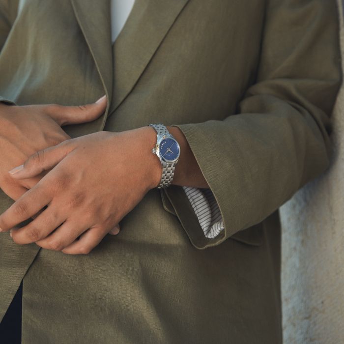 スタイリッシュなブレスレットを組み合わせたミッドナイトブルーの26mmのダイヤルが、昼夜を問わずエフォートレスで洗練されたスタイルを演出します。