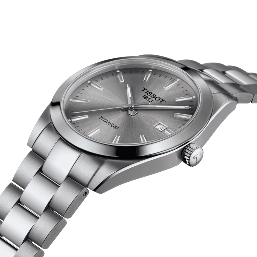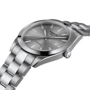 サンレイダイアルが美しい光沢を放つグレーダイアル×チタンケースのコンビネーションは落ち着きと知性を感じさせ、オン・オフ問わず使いやすい1本です。 軽く、耐傷性能に優れるチタンを素材が加わり、ライトな着け心地を叶えています。