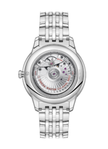 この直径41 mmのステンレススティール製モデルは、サンブラッシュ仕上げのドーム型PVDダークブルーダイアルを備えています。表示には、ロジウムプレートの針と、交互にセットされたローマ数字とカボションカットインデックスが採用されています。