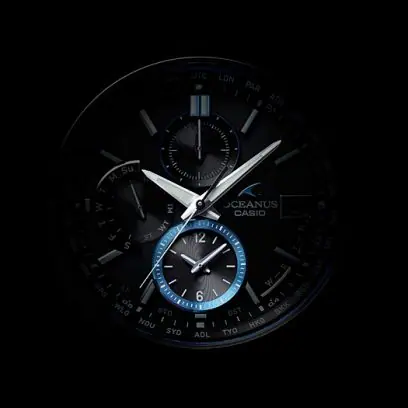“Elegance, Technology”をブランドコンセプトに、上質と多機能を追求しているOCEANUSのクラシックラインです。 シンプルなクロノグラフデザイン。ワイドフェイスのダイアルは見やすく文字板を2枚重ねることで立体感を演出しています。風防には両面反射防止コーティングを施したサファイアガラスを採用。熟練の技を要するザラツ研磨、チタンカーバイト処理によるケース・バンドの表面硬化など細部に至るまで上質な仕上げを施しました。更にデュアルダイアルワールドタイムを搭載し、ホームタイムとワールドタイムの2都市の時刻を同時に表示可能。