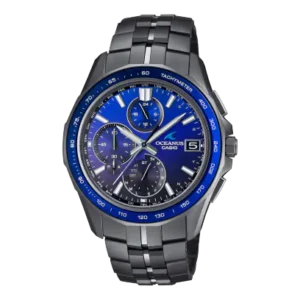 “Elegance, Technology”をブランドコンセプトに、上質な仕上げと薄く美しいフォルムを追求しているOCEANUS Manta(マンタ)より、流麗かつスポーティなフォルムに仕上げたOCW-S7000です。 ベゼルにはリング状に加工したサファイアガラスを配し、見る場所や角度で表情が変わっていく、美しい青の輝きをお楽しみいただけます。 また、タキメーターを配し、クロノグラフらしいスポーティなデザインに仕上げています。文字板にはブルーからブラックに変化するグラデーション蒸着を施しています。また、バンドとケースにはDLC処理を施し、力強い印象を与えています。 機能面では標準電波受信機能による時計単体での時刻修正に加え、スマートフォンリンクによるワールドタイムの設定なども可能。これらの高機能を厚さ9.5mmのスリムケースに収めました。 機能性とデザイン性を兼ね備えた上質なOCEANUS Mantaです。