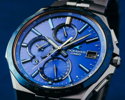 “Elegance, Technology”をブランドコンセプトに、先進のテクノロジーとスポーティデザインを併せ持つOCEANUSより、空が濃い青に染まり、地平線や水平線がぼんやりと明るく見える神秘的な情景のブルーアワーをデザインに落とし込んだモデルです。 文字板全体にブルー蒸着を施し、12時位置の時字にはピンクゴールドIP、風防ガラスの縁にもピンクゴールドを蒸着。また、ベゼルにはブルーIPを施すことにより、OCEANUSブルーを楽しめる1本に仕上げています。 標準電波受信機能による時刻修正に加え、スマートフォンリンクによる時刻修正機能を搭載。ワールドタイム約300都市に対応し、タイムゾーンやサマータイムに自動で変更できます。 厚さ9.7mmのスリムケースで薄く美しいフォルムも実現し、機能性とデザイン性を兼ね備えた上質なOCEANUS Mantaです。
