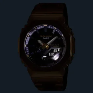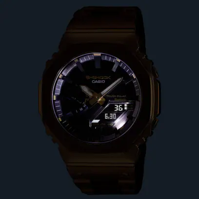 G-SHOCK初代モデル「DW-5000C」のコンセプトを受け継いで開発されたデジタル/アナログ「GA-2100」シリーズのフルメタルモデルです。 スクリューバックケース、ベゼル、バンドにステンレスを採用し、落下時の衝撃からモジュールを守る耐衝撃構造をとりながらも、無駄を省いたシンプルなデザインを目指しました。 八角形のベゼル形状やバンドのディンプルデザインも継承し、イエローゴールドカラーのIPコーティングを施しています。 高密度実装技術によりスリムで高機能なモジュールを搭載することで、薄型化を実現。着け心地の良さにもこだわりました。