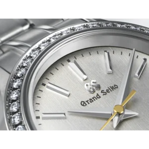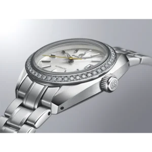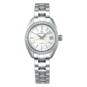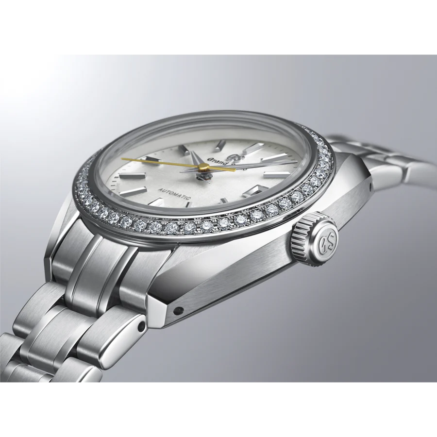 直径 27.8mm の小さなケースの中に本格的なメカニカルムーブメントを搭載した、日常で使いやすいステンレススチールモデルです。 ダイヤルは、美しい絹の布のような型打模様に真珠の輝きのようなパール仕上げを施しており、ベゼルに 45 個配置されたダイヤモンドとともに腕もとで上品かつ華やかに輝きます。