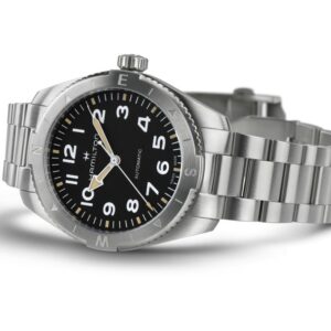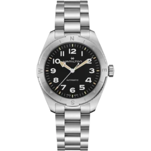 大自然へと誘う「カーキ フィールド エクスペディション」は、どんな場所にも敵応するアドベンチャーウォッチ。コンパスのデザインが、太陽が頼りとなる冒険の旅で進むべき道を示してくれます。41mmのステンレススチール製ケースと、ケースにマッチするブレスレット、さらにムーブメントを悪天候から守るねじ込み式リューズを備えています。質感のあるブラックダイヤルに、視認性に優れるスーパールミノバ?加工を施した「カーキ フィールド エクスペディション」は、いかなる状況下でもタフさを発揮します。
