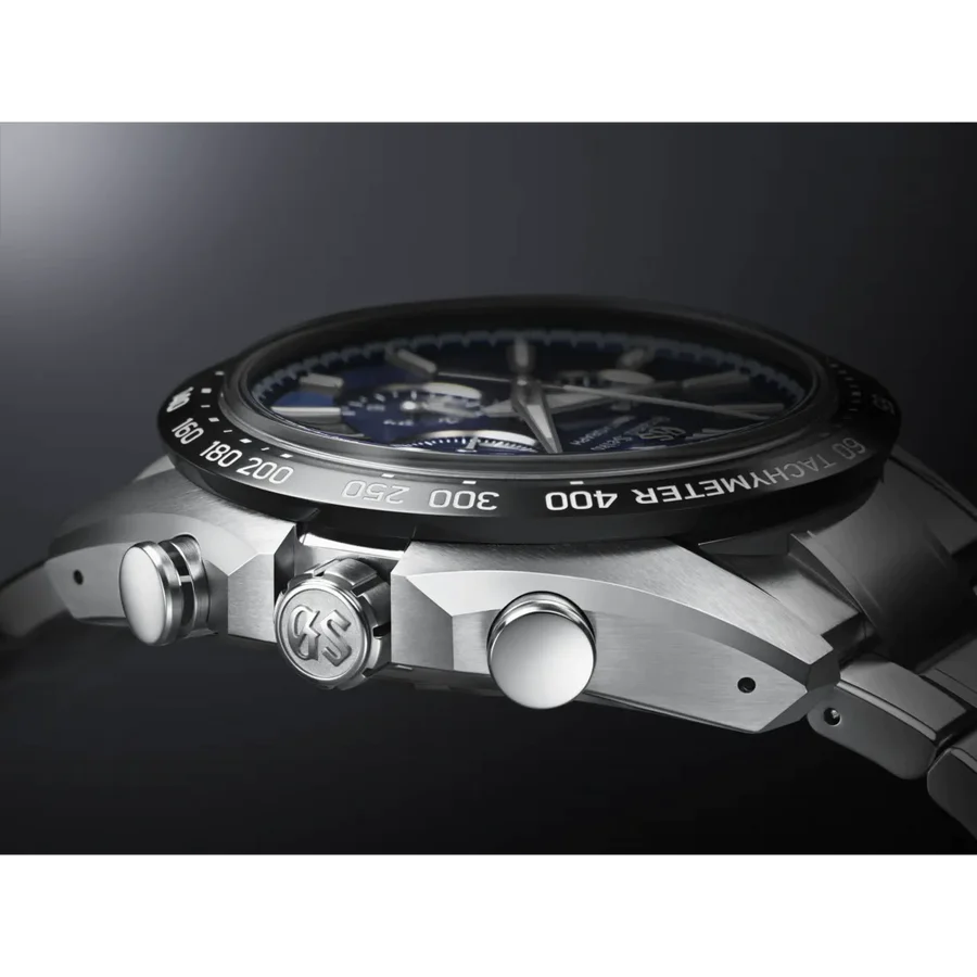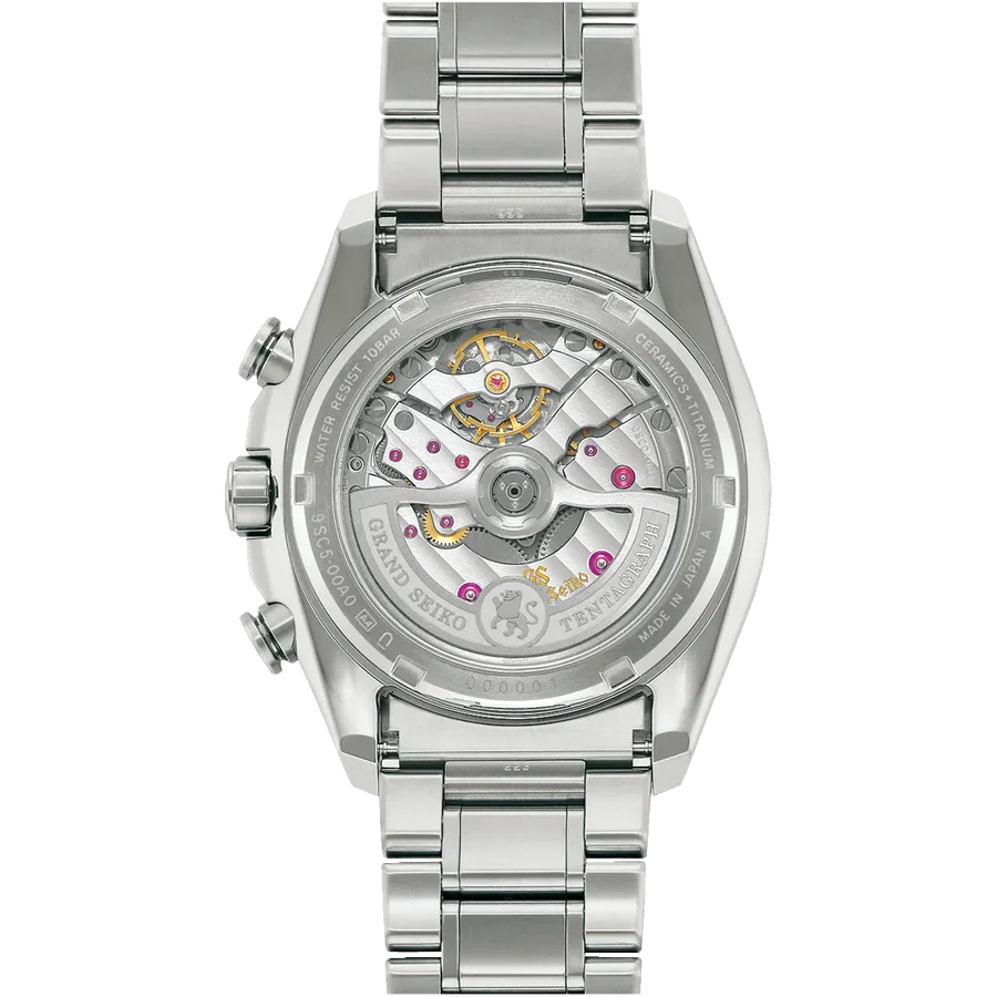 さらなる高みを目指した、エボリューション9コレクションの 高精度なメカニカルクロノグラフ“TENTAGRAPH” ストップウオッチ機能を搭載したグランドセイコー初のメカニカルクロノグラフです。 次世代のグランドセイコーを象徴する毎秒10振動のハイビートクロノグラフムーブメント「キャリバー9SC5」を搭載し、10振動のメカニカルクロノグラフとしては世界最長となる、最大巻上時約72時間(約3日間)持続を実現しています。 さらに、独自のデザイン文法「エボリューション9スタイル」をベースに、デザインをスポーティにアップデートし、「動きながらの使用」に着目して直感的な使いやすさ、見やすさを進化させました。 堅牢で軽量なブライトチタン製のケースとバンド、セラミックス製のベゼルが陰影を美しくまとい、「グランドセイコースタジオ 雫石」から望む雄大な岩手山の山肌を表現した「岩手山パターン」のダイヤルと相まって、豊かな光の表情を導き出します。