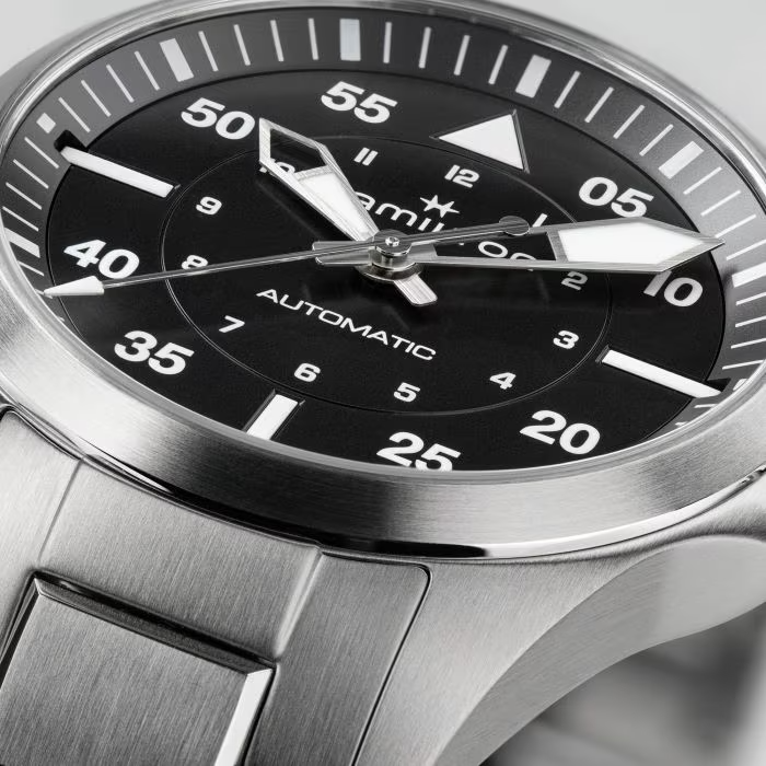真の航空ファンのために作られた「カーキ パイロット」は、「カーキ」の探究心や冒険心を呼び起こします。この36mmのモデルは、ニヴァクロン?製ヒゲゼンマイを備えた標準持続時間80時間のH-10自動巻きムーブメントを搭載し、より小さなサイズの腕時計を求めるトレンドに応えます。このモデルはコックピットに求められる精度を満足し、よりコンパクトなデザインのために空中や地上で活躍します。「カーキ パイロット」は、タイムレスなステンレススチール製ブレスレットにスタイリッシュなブラックダイヤルを組み合わせており、特殊なスーパールミノバ?加工が施されています。