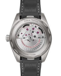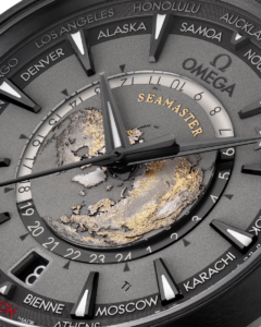 ダイアルとその外側のリングの周りには、オメガのホームタウンであるスイス・ビエンヌを含む世界の地名が記され、すべてグレーのカラーで彩られています。ロンドンだけは例外で、協定世界時としても知られるグリニッジ標準時であるロンドンだけは例外で、赤でハイライトされています。