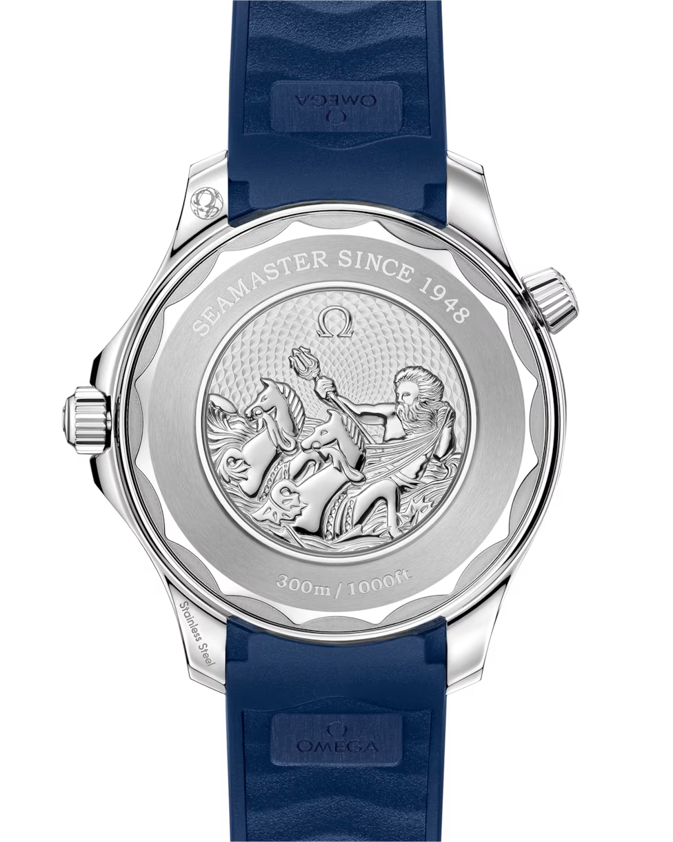 時計の裏側には三叉槍をもつポセイドンと、1956年のオリジナルデザイン、そして現在のデザインのふたつのシーホースを描いたシーマスターの記念ロゴがあしらわれています。