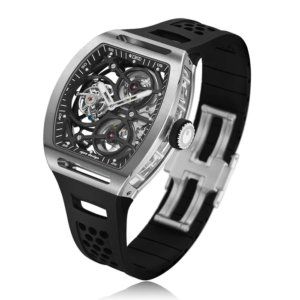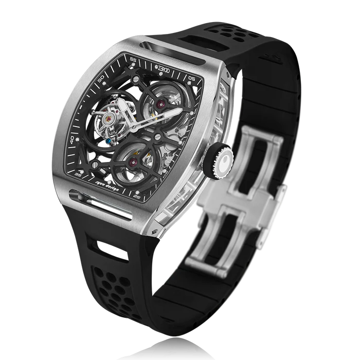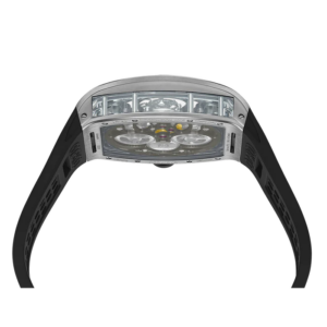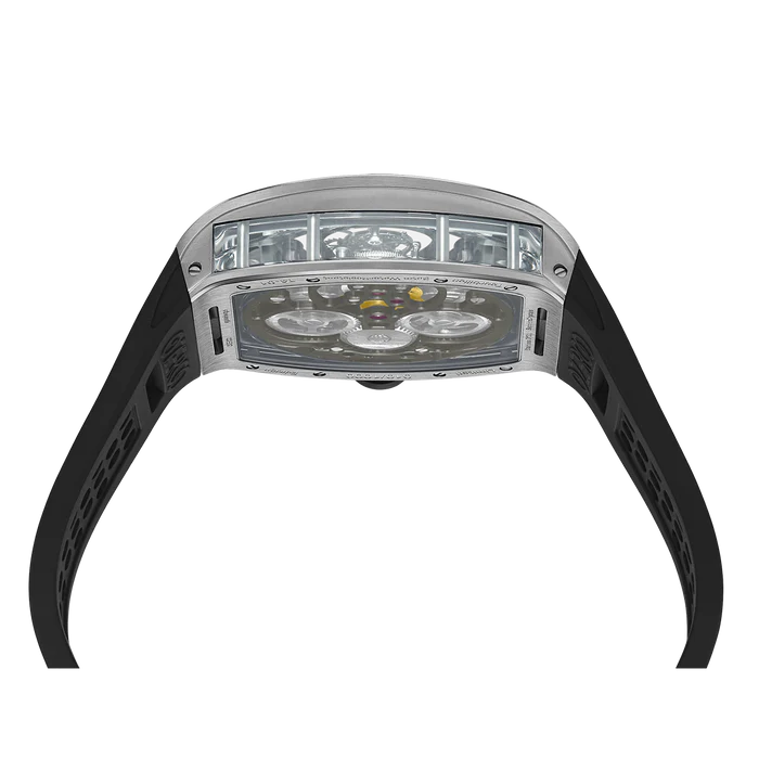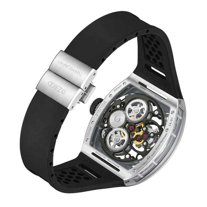 精緻な機構の全てが見えるブリッジのないフライングトゥールビヨン。T4-01ではキャリッジ形状が渦巻型にリニューアルされカラーもシルバーに変更されました。ダイアルフレームも機構と一体型の構造にブラッシュアップ。文字をなくすことでスッキリと仕上げられています。