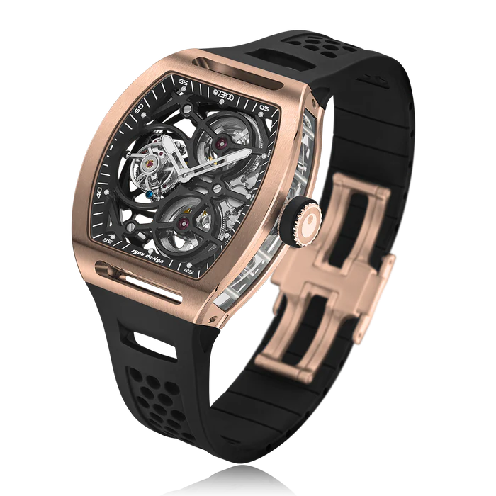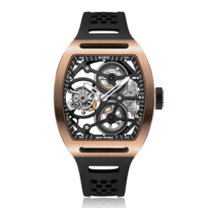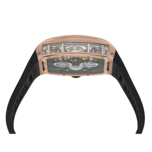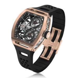 精緻な機構の全てが見えるブリッジのないフライングトゥールビヨン。T4-01ではキャリッジ形状が渦巻型にリニューアルされカラーもシルバーに変更されました。ダイアルフレームも機構と一体型の構造にブラッシュアップ。文字をなくすことでスッキリと仕上げられています。