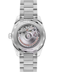 オメガと海の豊かな歴史にオマージュを捧げる「シーマスター アクアテラ」。シンメトリックな38 mmケースはステンレススティール製で、ポリッシュ仕上げのリュウズ、ケースバックにはウェーブ模様で縁取られたデザインが施されています。