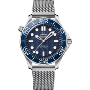 ジェームズ・ボンド60周年を記念して2022年に発表された、42mm径のステンレススティール製「シーマスター ダイバー300M」。1995年の映画『007/ゴールデンアイ』でジェームズ・ボンドが身に着けた「シーマスター ダイバー300M」にインスピレーションを得たこのモデルは、シュウ酸アルマイト処理を施したブルーのアルミニウム製ダイアルに、レーザーで波模様のエングレービングが施されたデザインです。ダイビングスケールには、オメガの伝統である逆三角形の代わりに、60周年を記念する「60」の数字が添えられています。