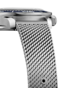 合わせられているのは、ブラッシュ仕上げを施したステンレススティール製ブレスレット。『007/ノー・タイム・トゥ・ダイ』に登場するボンドのチタン製ウォッチと同様のエレガントなメッシュスタイルで、ウォッチのメタリックな外観さらに引き立てています。