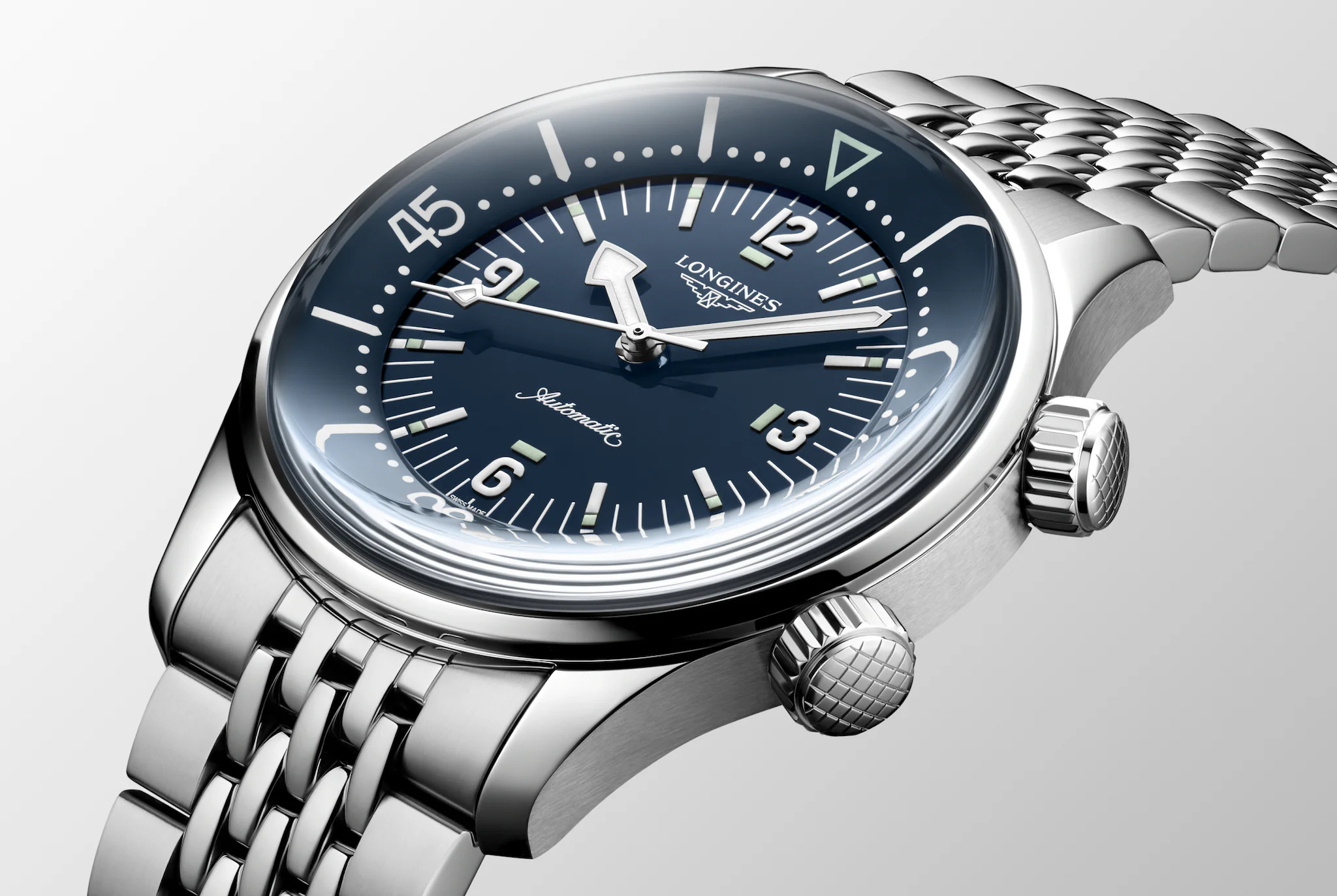 2つのリューズと内側の回転ベゼルによって、ひと目で分かる印象的なスタイル。インスピレーションの源となった1959年製オリジナルモデルに忠実に、新作のロンジン レジェンド ダイバーウォッチが、直径 39 mmケースで再登場。